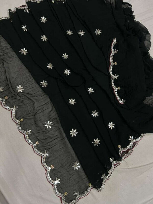 Introducing our Black Beauty — a stunning Cutwork Saree designed to add timeless elegance to your festive and party looks.