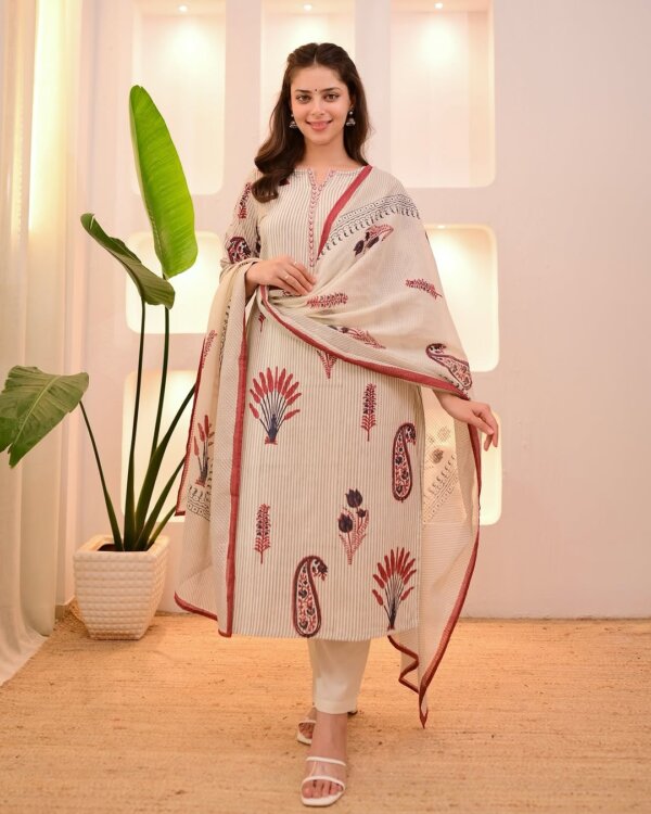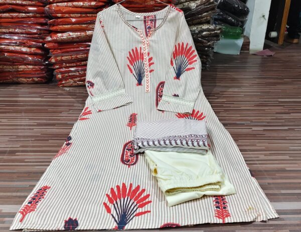 Get ready in our easy breezy cotton suits, beautifully adorned with tagai embroidery and delicate handwork, making them a perfect blend of comfort and elegance. Designed with charming prints and paired with matching solid comfort-fit pants and a cotton dupatta, this ensemble is ideal for festive wear, casual gatherings, and daily elegance.