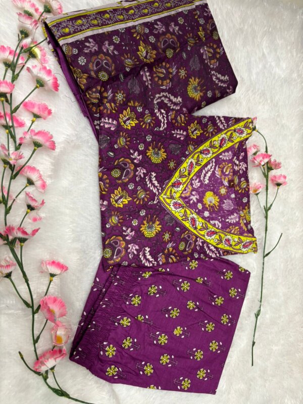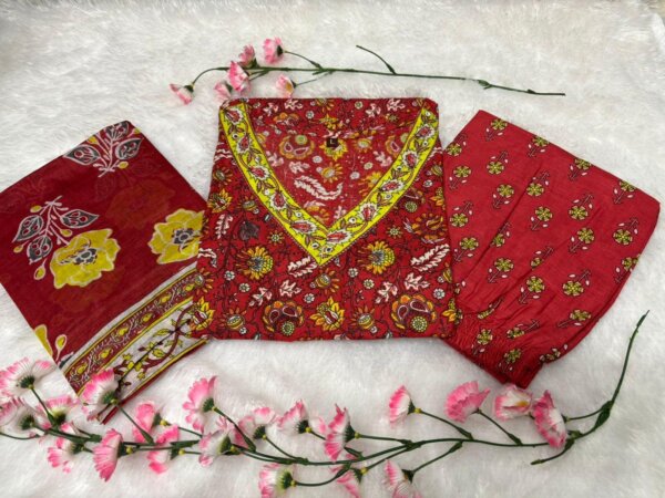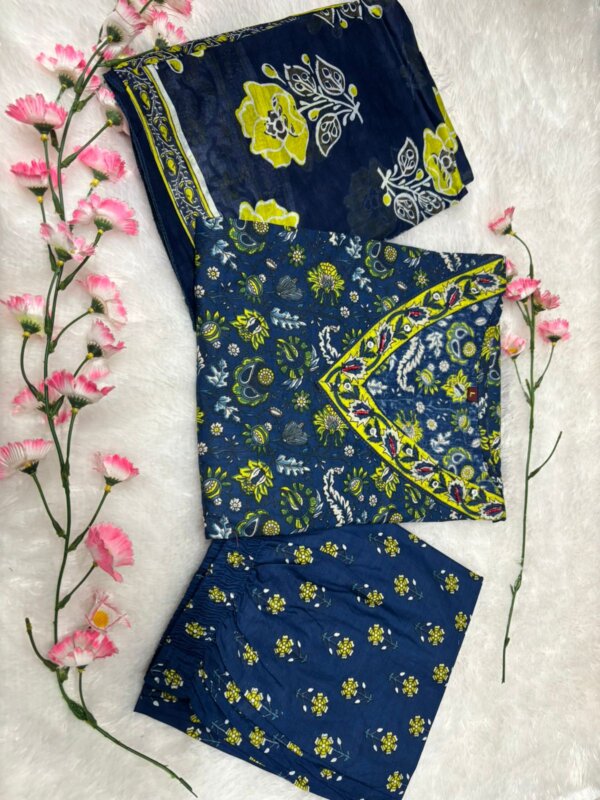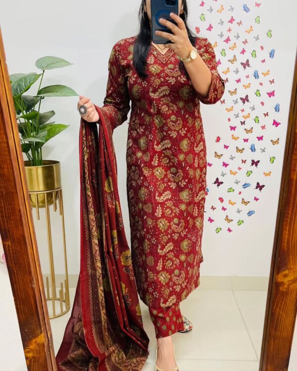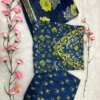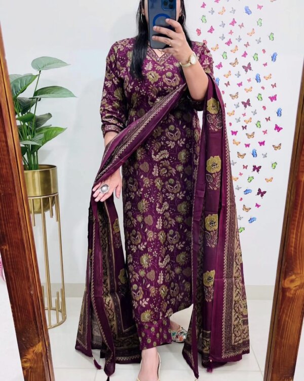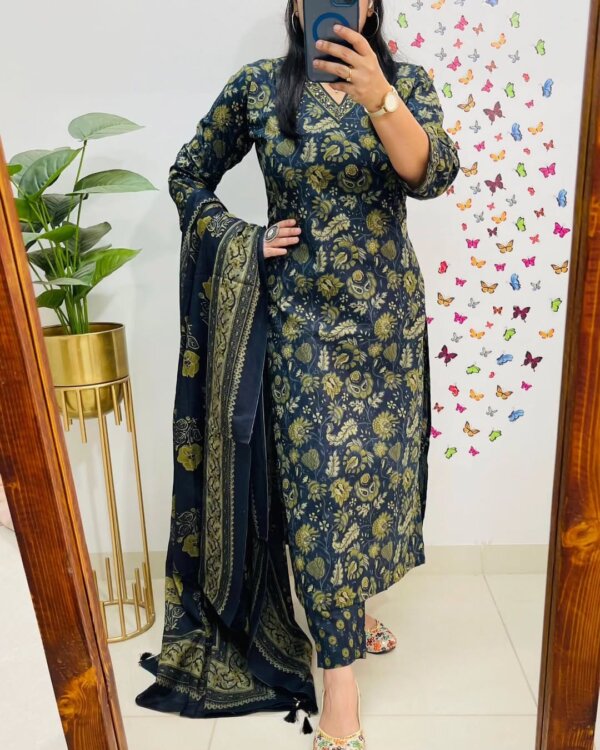 Introducing the latest addition to our fashion collection – a stunning cotton kurta set, designed with exquisite print work and paired with a matching pant. To enhance its charm, the kurta is adorned with beautiful aari work on the neckline and comes with a cotton malmal printed dupatta, making it a perfect blend of tradition and elegance.