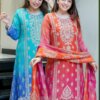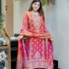 Celebrate the season in style with our exclusive Chandani Suit Set, crafted from luxurious pure chinon fabric and enhanced with full neckline embroidery & delicate handwork. This elegant ensemble is designed with festival-inspired prints, offering the perfect balance of tradition and sophistication.