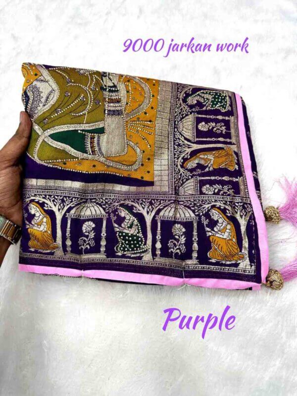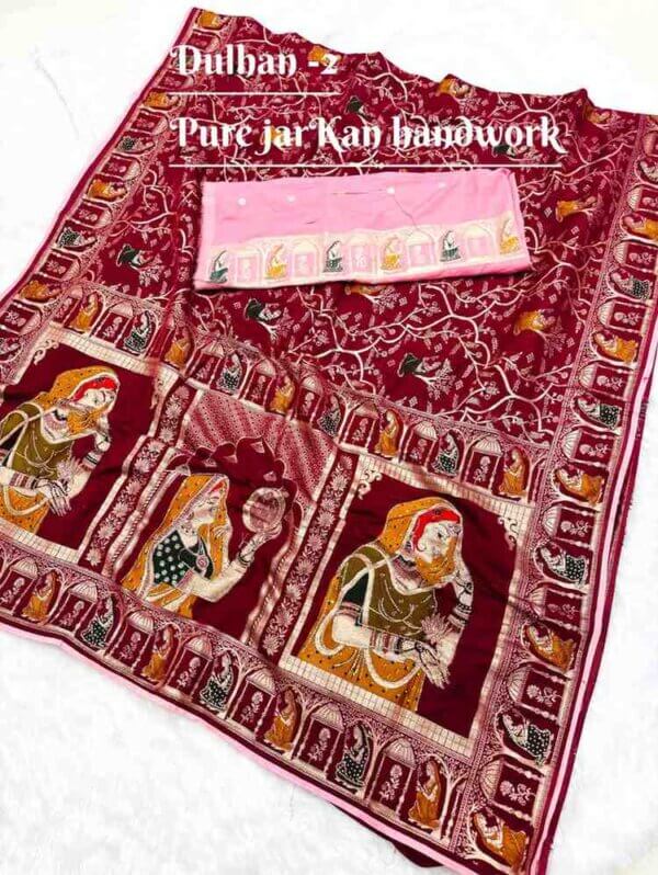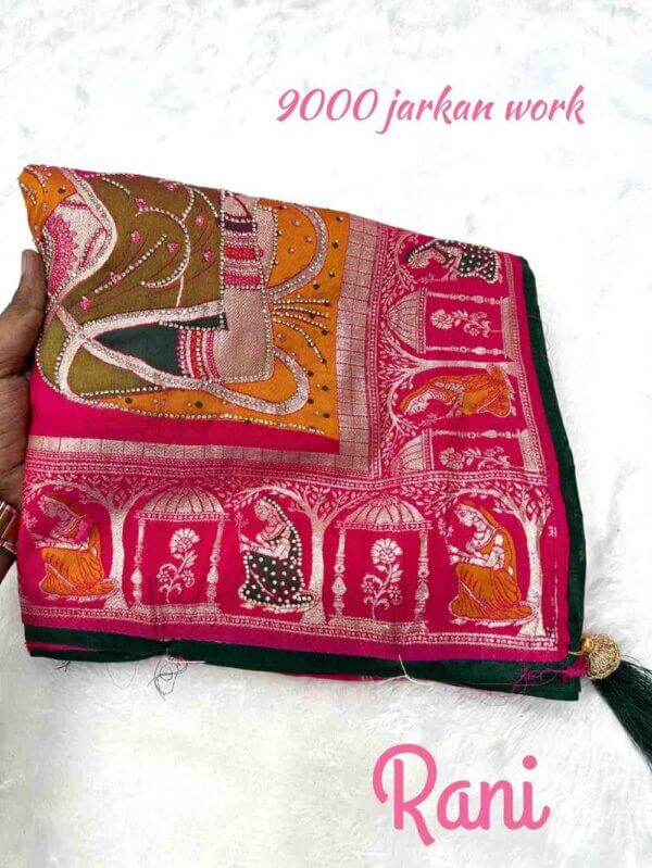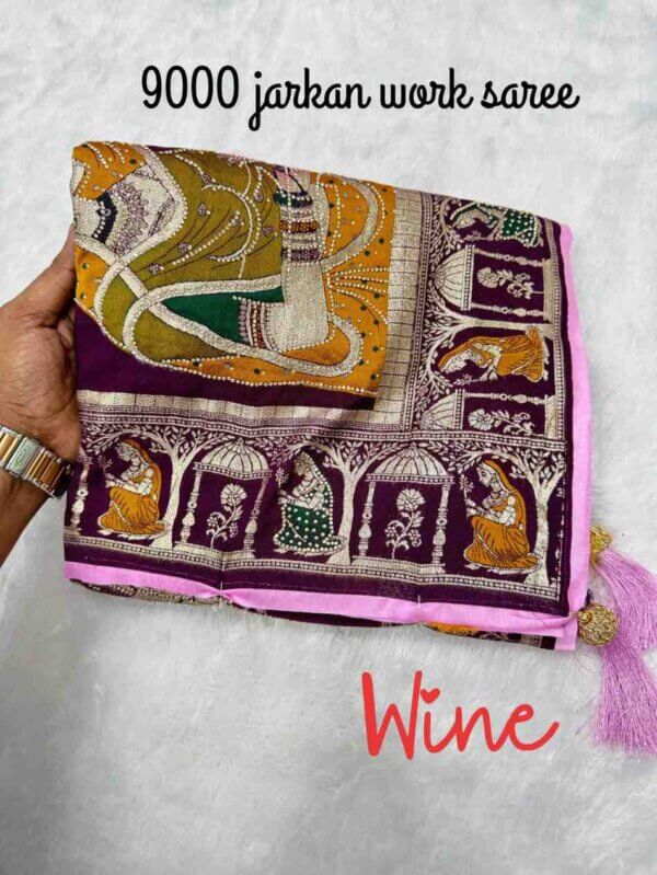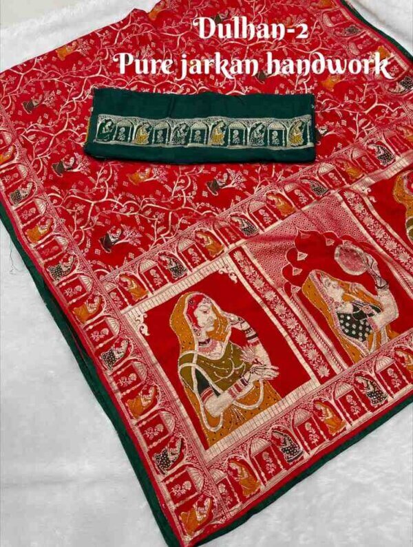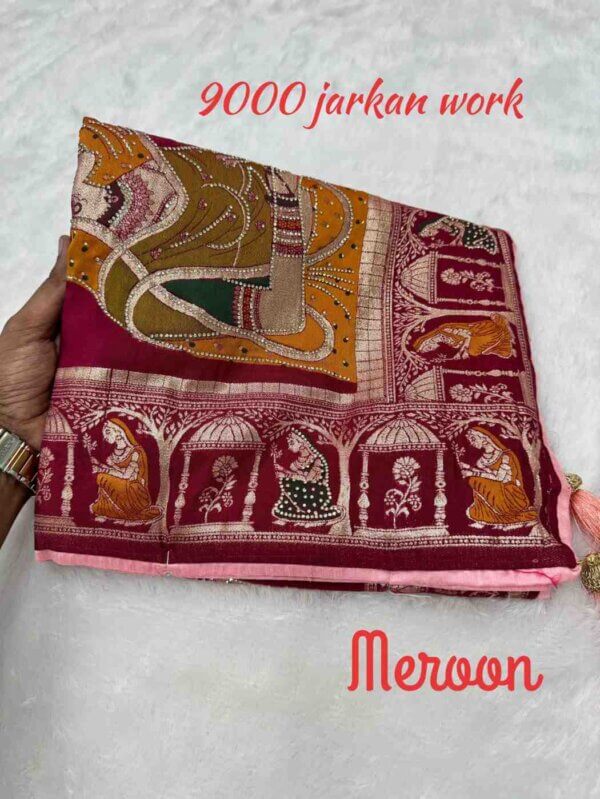 Bringing you the charm of tradition with intricate Jarkan hand embroidery, this saree is a true masterpiece of craftsmanship. The royal red drape with golden detailing celebrates the elegance of Indian heritage while making you the star of every occasion.