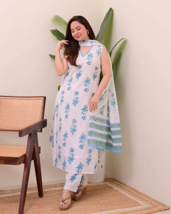 💃 Introducing our new summer collection crafted from luxurious cotton (60×60). Designed with handblock prints & neck lace work, this outfit is lightweight, breathable, and perfect for hot days.
